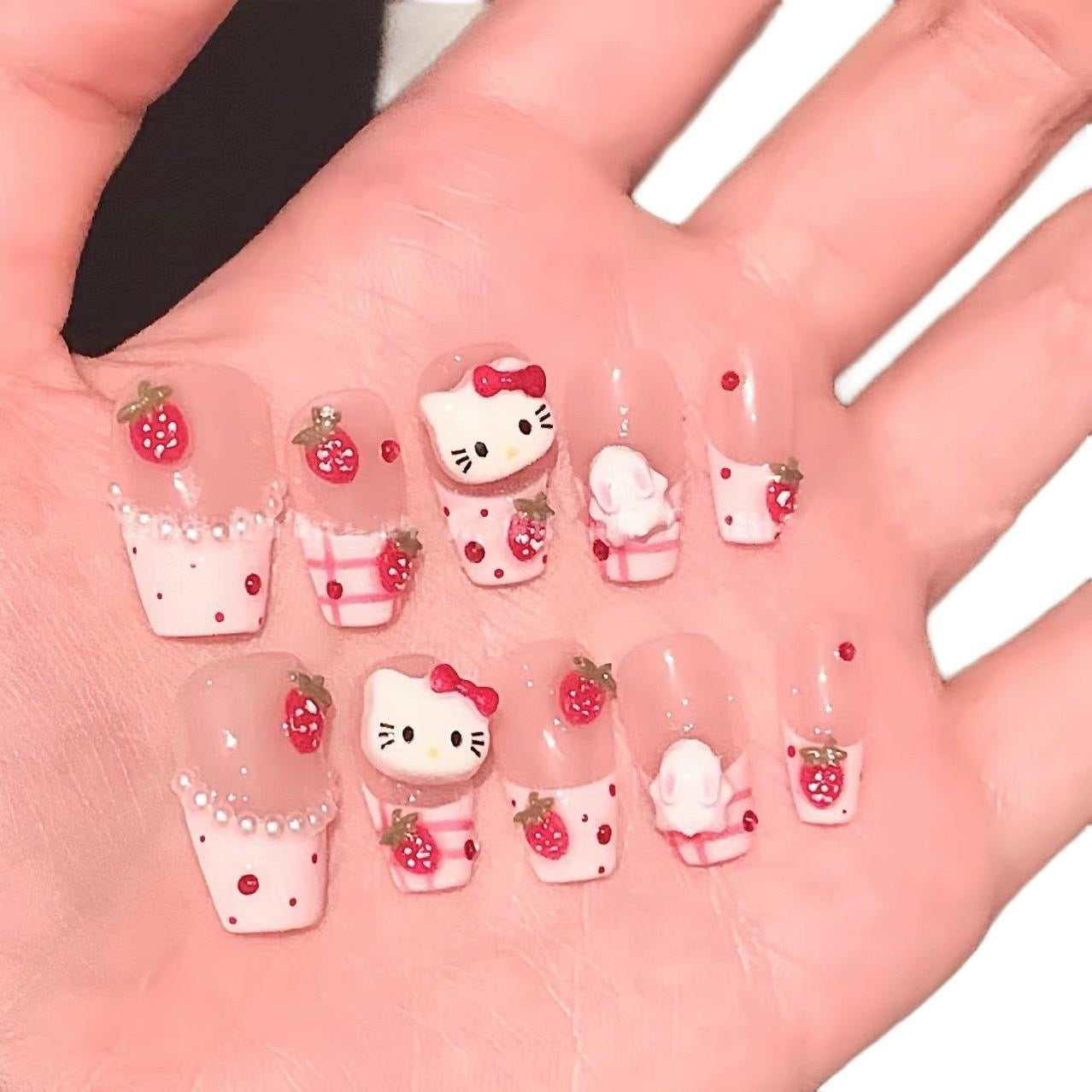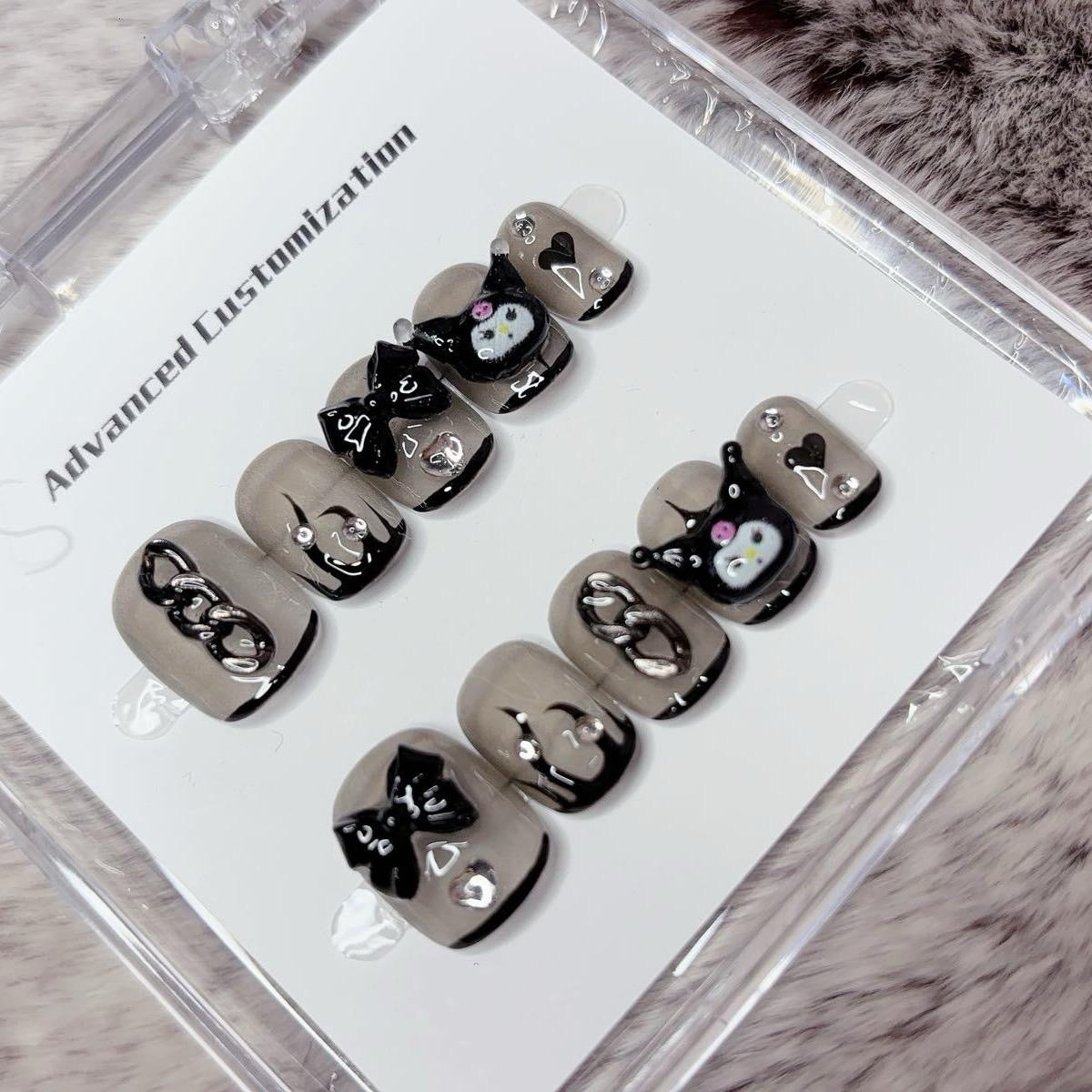 Short Round Press-On Nails with Bear & Bowknot Design | Tipora 005