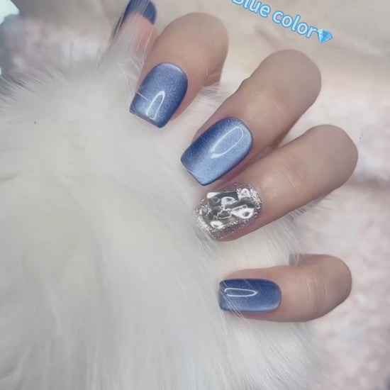 Press on Nails Short Square Shape Gem-Like Blue Color with Sparkle Design 129